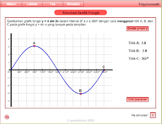 Media ini memiliki fitur: materi, latihan, tes, dan simulasai. Materi meliputi beragam grafik sinus dan cosinus.